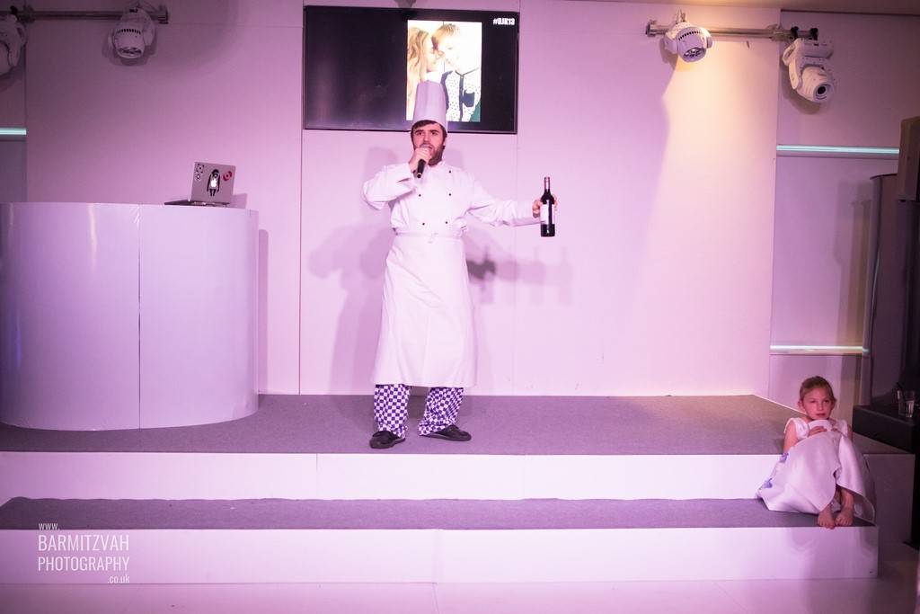During the main course, an announcement will be made by the ?Manager? about the ?Chef’ who is leaving the venue/catering company, and is being allowed to say a few words. The 20 -25 minute act starts from here and is a complete surprise to the guests. Songs within the act include; ‘Mazal Tov’, ?Tradition’, ‘To Life’, ‘Sunrise Sunset’, ‘Thats Amore’, ‘Nessun Dorma’ and Israeli Dancing (7-minute dance medley of all the classics which includes optional flag bouncing/chair lifting).